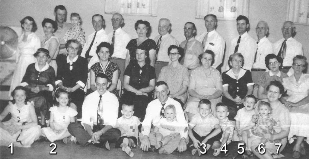 Anthony Christian Church, September 1954. My dad is standing in the top row, third from the right. In the front row: my best friend, Joleen (1), my sister Mary (2), me, Frankie Ball (3), my boyfriend Howard Stewart (4), my brother John (5), my sister Ruth (6), and my mother (7).